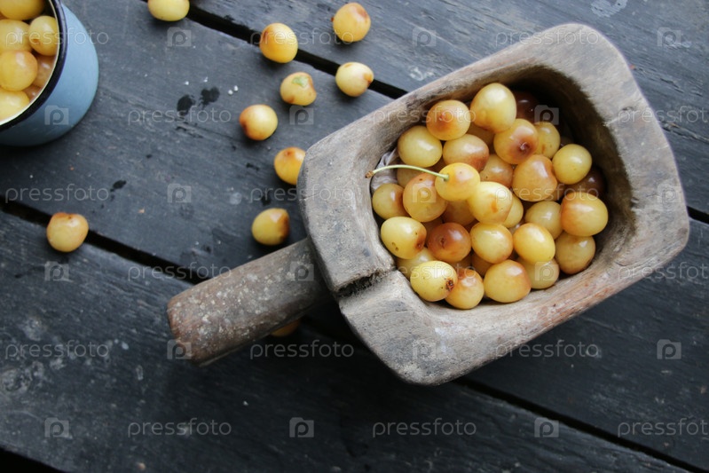 Свежие вишни на винтажном столе. Здоровая еда