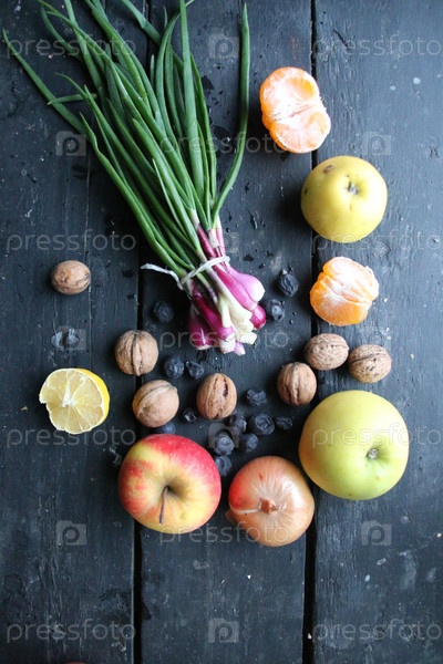 Петрушка и фрукты на старом винтажном столе. Идея здорового питания