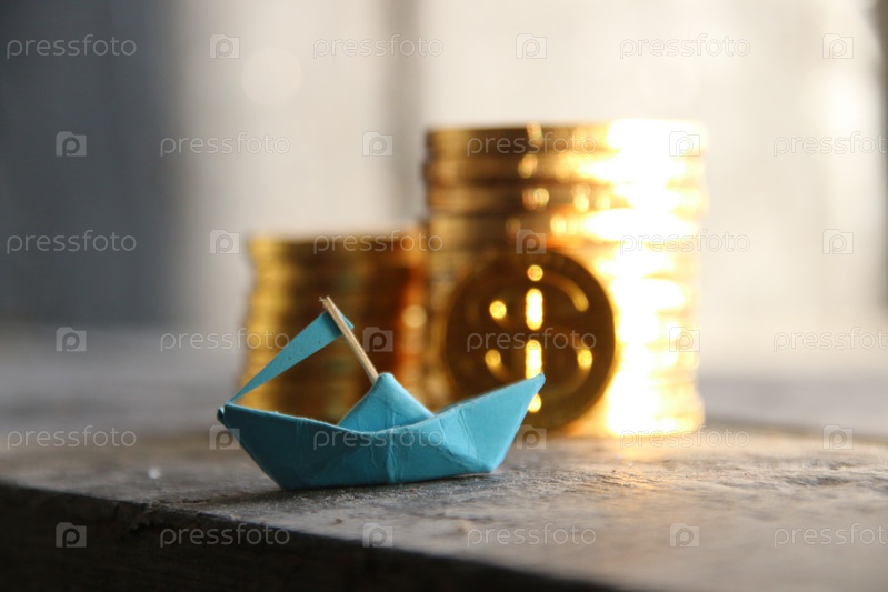 Успешная концепция запуска, график золотых монет и бумажный кораблик