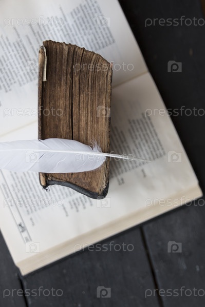 Мудрость или научная концепция, винтажная книга и белое перо