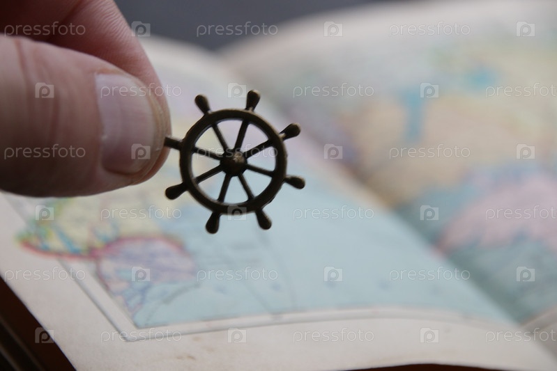Рука держит руль на фоне морской карты