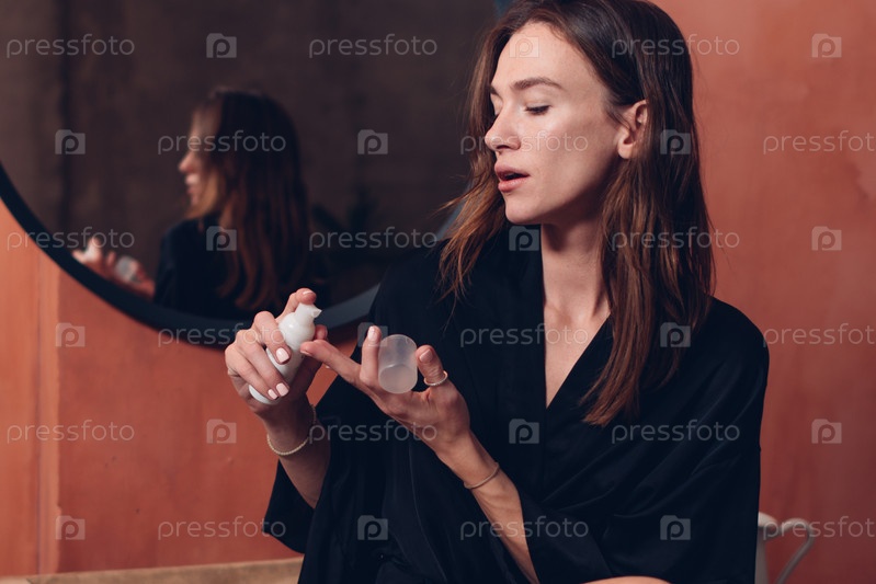 Женщина выжимает лосьон на палец. Красота и косметика