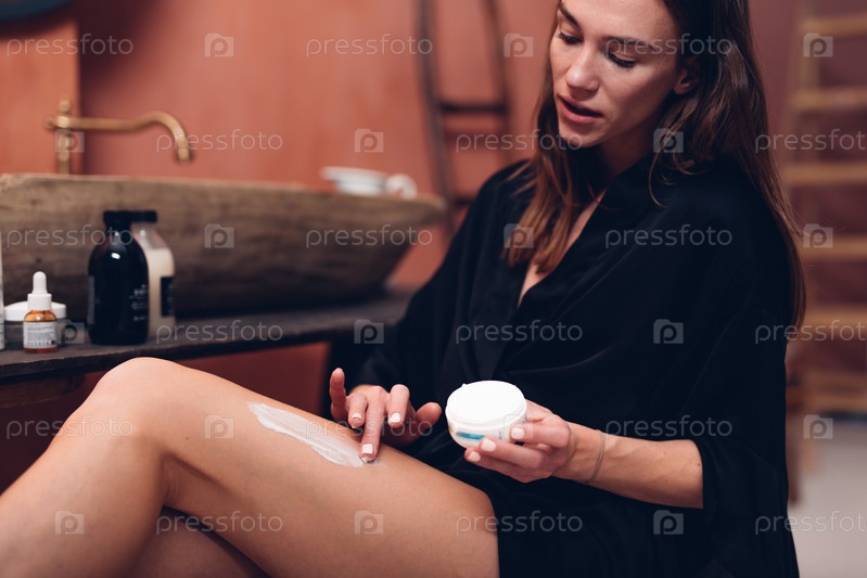 Женщина наносит крем на ногу