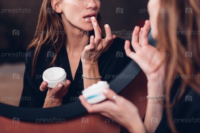 Женщина наносит питательный бальзам на губы, увлажняя кожу