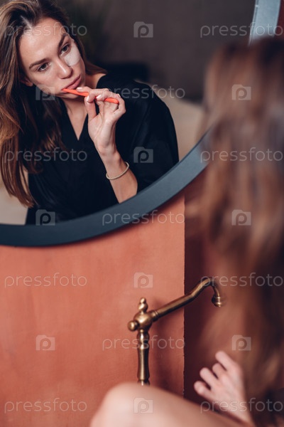 Молодая женщина чистит зубы, у нее патч под глазом