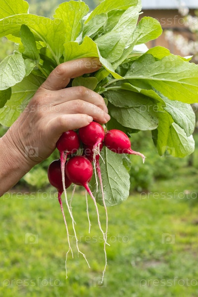 Собранный на приусадебном участке урожай редиски держится на руках у владельца участка. Витаминный продукт для натурального питания