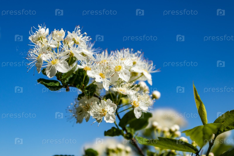 Белые цветы Spiraea vanhouttei в солнечный день с каплями росы. белая смазка