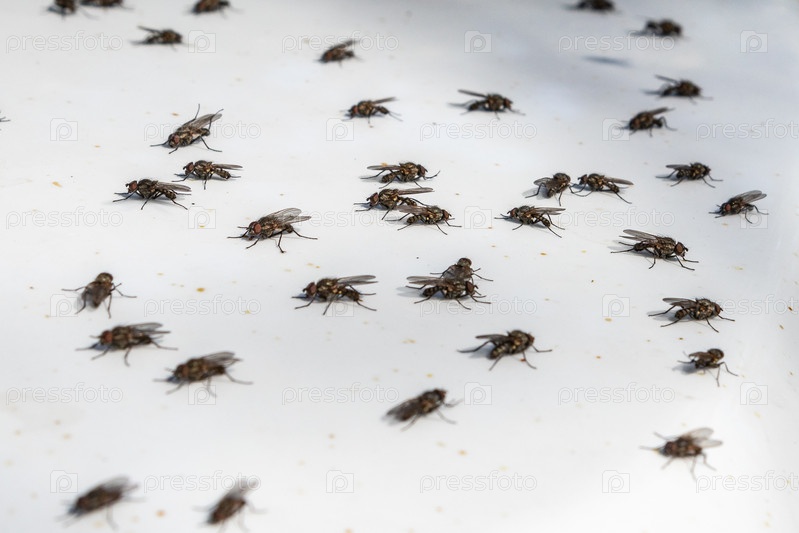 Мухи Musca domestica, сидящие на белой поверхности. в крупном плане