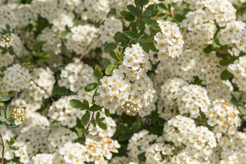 Белые цветы Spiraea vanhouttei в солнечный день с каплями росы. белая смазка