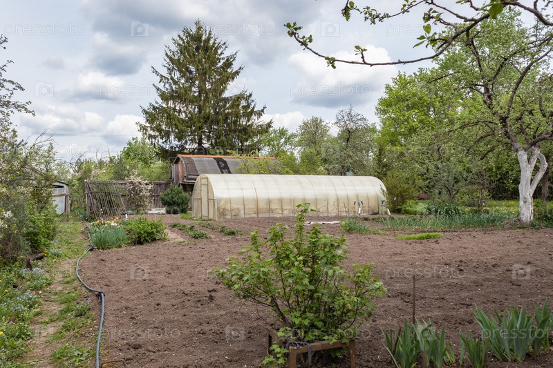 Загородный дом, теплица с обрабатываемой землей в окружении зелени весной в России. Русская дача