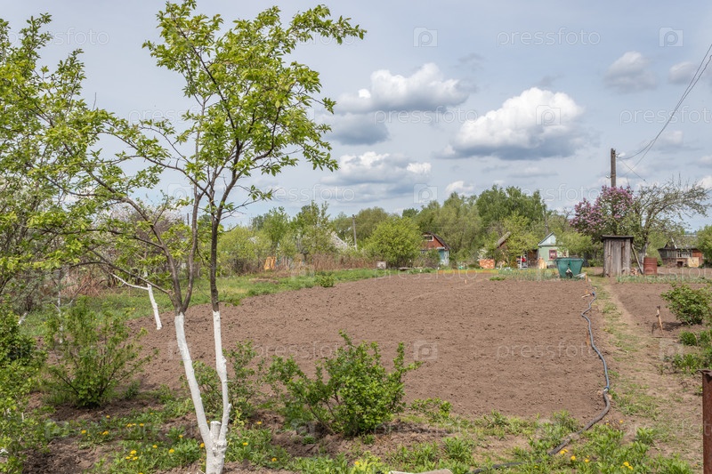 Загородный дом с обрабатываемой землей в окружении зелени весной в России. Русская дача