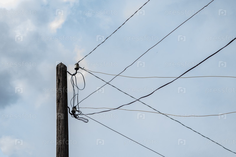 Старый деревянный электрический уличный столб с большим количеством проводов. электрические провода на фоне голубого неба