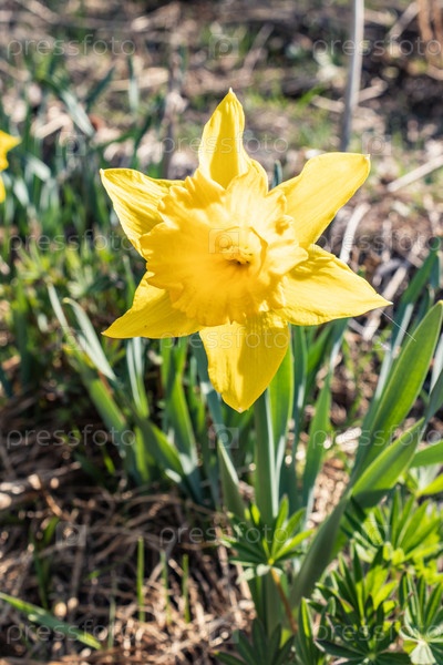 Нарцисс цветок весенний солнечный день. Цветы и зеленые листья в качестве фона. Идеальное изображение для весеннего фона, цветочного пейзажа. нарцисс фон