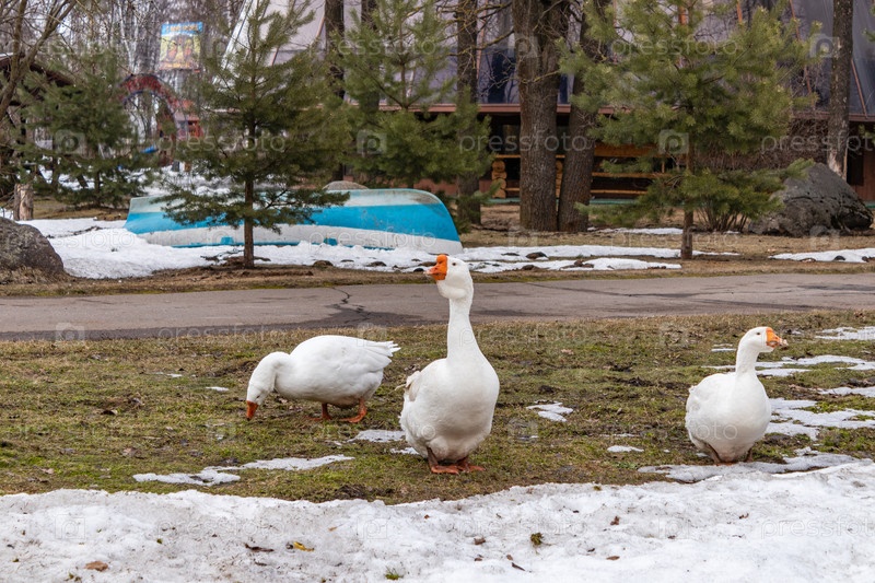 Стая домашних белых гусей на весенней лужайке. Сельский пейзаж. Ходят белые домовые гуси. Домашние гуси