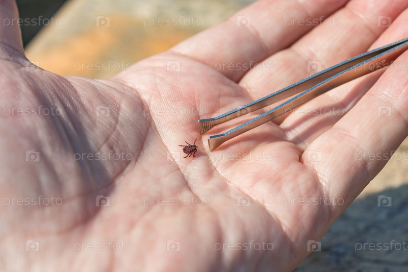 Клещ Ixodes ricinus ползет по коже человека. энцефалитический клеща. этот вид животных является носителем боррелия
