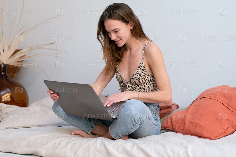 Видеозвонок женщины с помощью портативного компьютера, работающего на ноутбуке