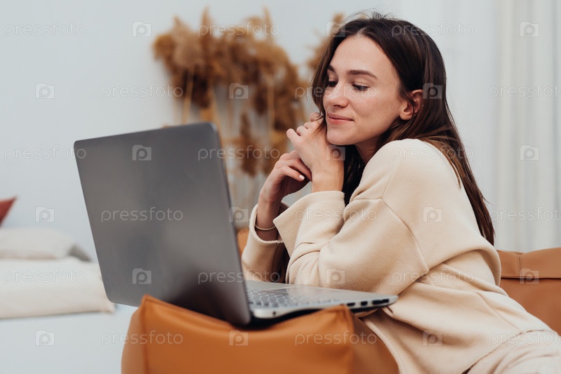 Женщина смотрит улыбаясь на экран ноутбука, смотря фильм или сериал