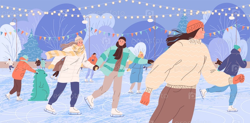 Люди катаются на коньках на катке зимним вечером