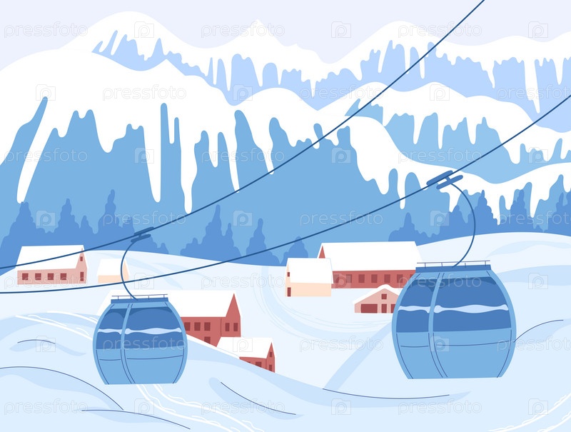 Зимний горный пейзаж с канатной дорогой. Лыжный курорт