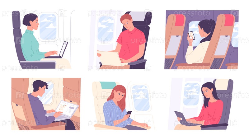 Люди, работающие во время путешествия или полета. Бизнес, работа и путешествия