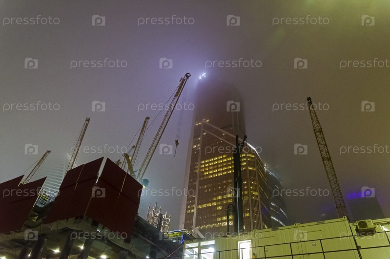 Густой туман скрывает небоскребы международного делового центра Москва-Сити. Холодный декабрьский вечер