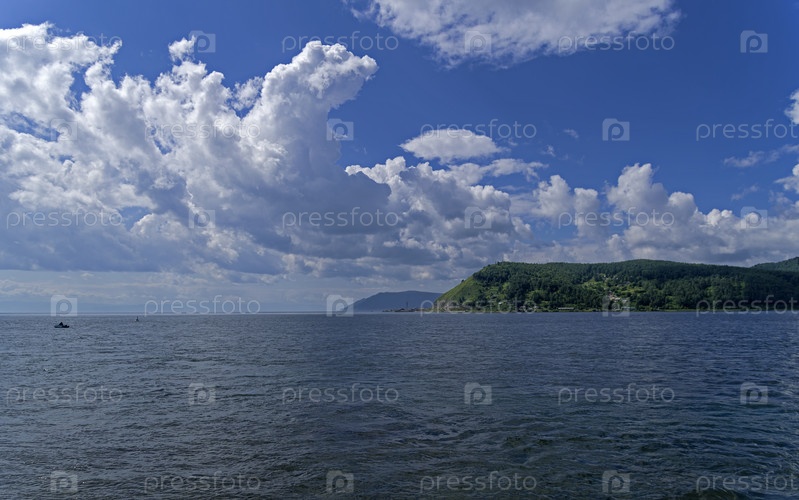 Красивые облака над Лиственничным заливом озера Байкал. Вид из поселка Листвянка. Солнечный день в августе
