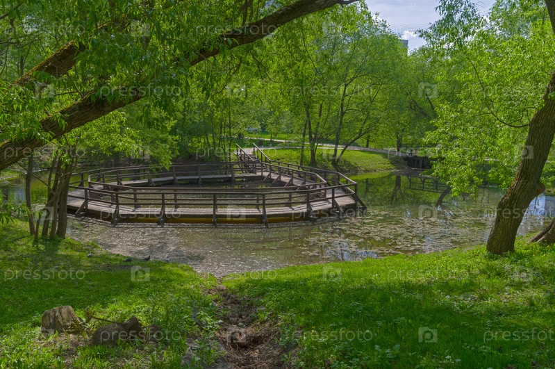 Троицкий пруд с кольцевым пешеходным мостиком. Коньково, Юго-Западный административный округ Москвы, солнечный день в мае