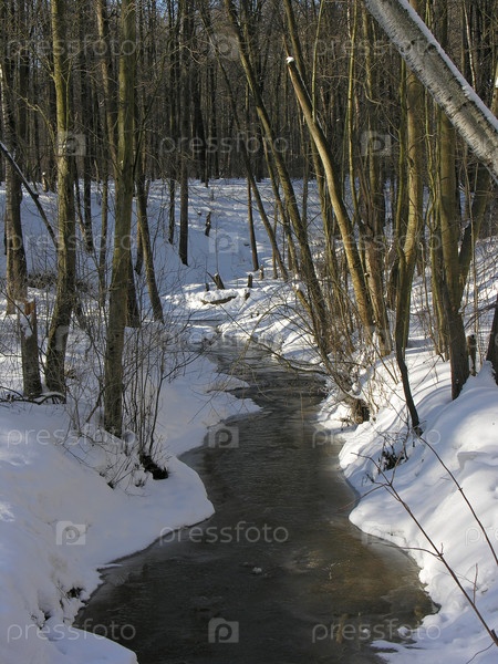 Незамерзающий ручей в зимнем лесу. Солнечный день в феврале
