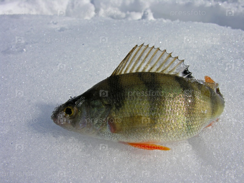 Трофей зимней рыбалки - небольшой окунь лежит на льду озера