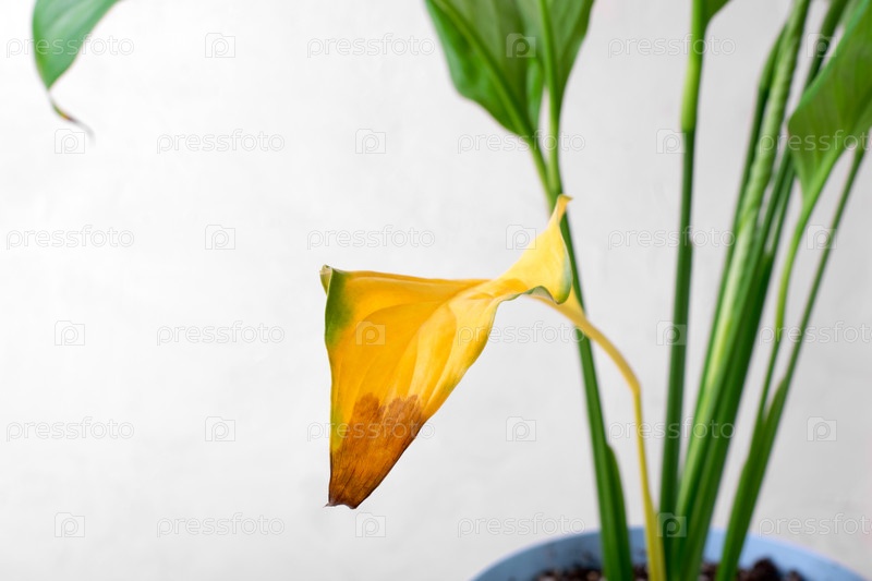 Растение спатифиллум с желтыми листьями. Неправильный уход за комнатным растением в горшке. Вредители, переувлажнение, корневая гниль или возраст