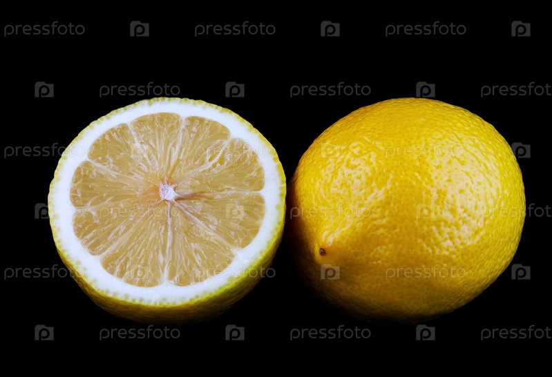 Целый лимон и половина лимона изолированы на черном фоне