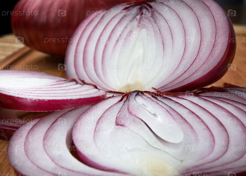 Сочный лук, нарезанный кольцами на деревянной доске крупным планом