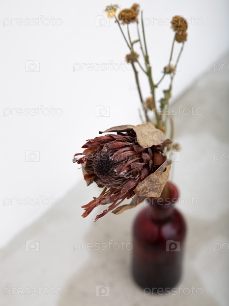 Сухие цветы в стеклянной вазе. Белый фон/ Букет задержанных цветов в стеклянной вазе на белом фоне