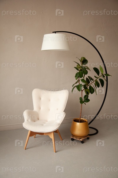 Бежевая гостиная: белое кресло, лампа и зеленое растение/ интерьер комнаты: белое кресло с лампой и растением в кашпо