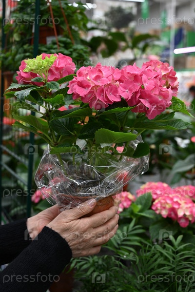 Руки садовника держат горшок с цветком в цветочном магазине или теплице. Женщина, держащая в руках примулу, придает растению товарный вид. Выборочный фокус