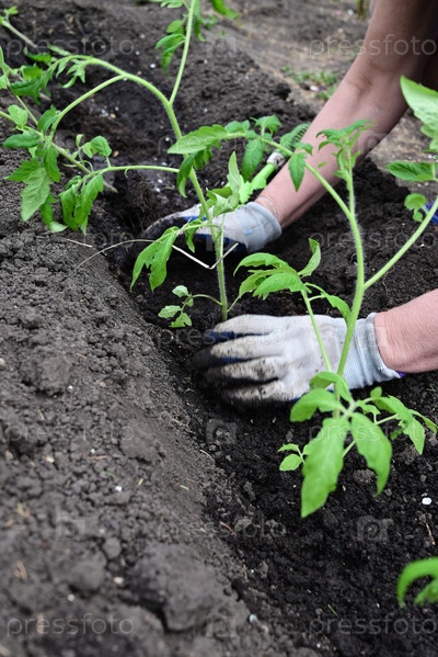 Рука подкладывает землю под зеленый помидорКонцепция ухода за растениями и выращивания органических продуктов