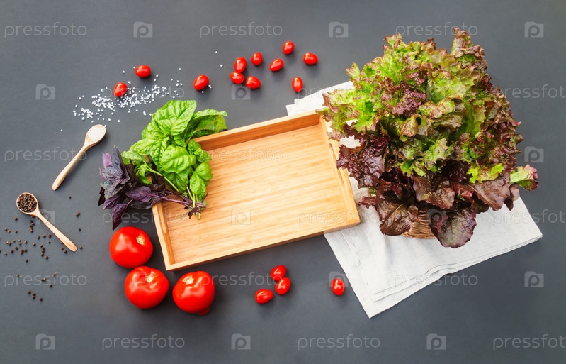 Деревянный поднос, помидоры, базилик и листья салата на темном фоне. Вид сверху, пространство для копирования
