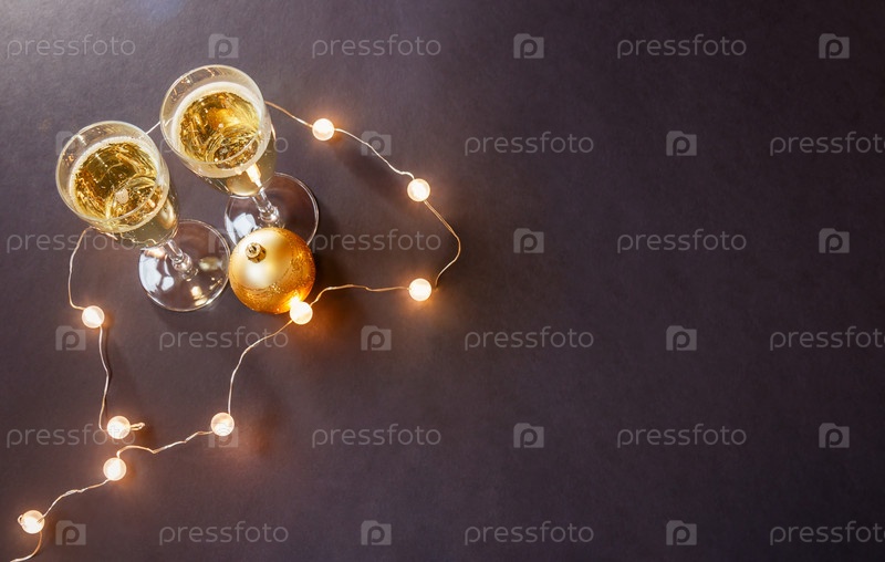 Бокалы шампанского, елочный шар и светящиеся рождественские огни. Вид сверху с копией пространства