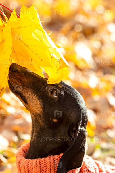 Портрет таксы в опавших листьях осеннего парка в солнечный день