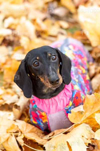 Портрет таксы в опавших листьях осеннего парка в солнечный день