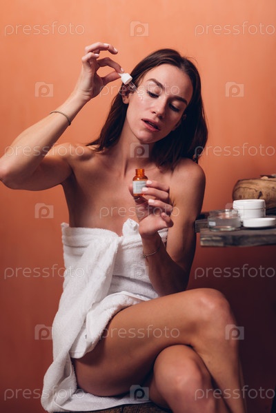 Молодая женщина наносит масло из пипетки на лицо