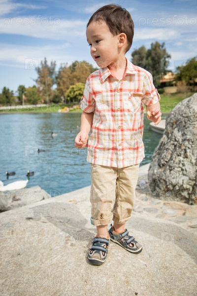 Молодой китайский и европейский мальчик развлекается в парке и утином пруду