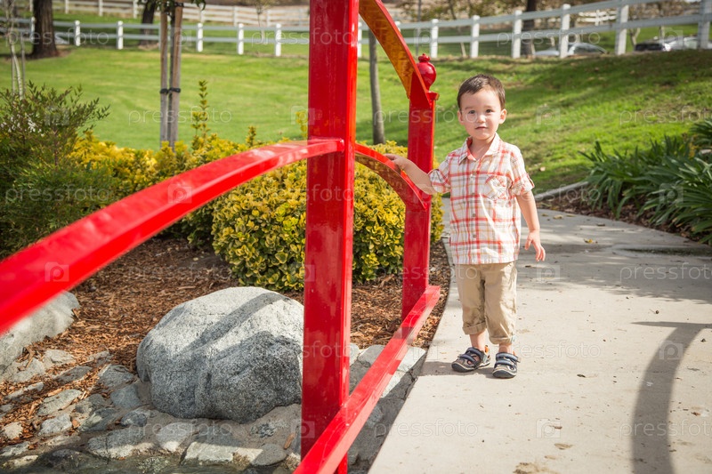 Молодой китайский и европейский мальчик, метис, развлекается в парке