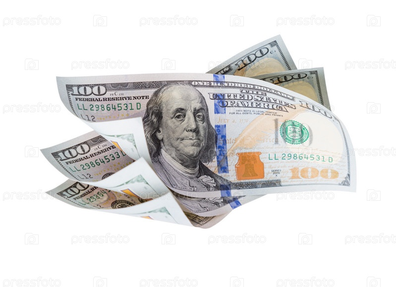 Три стодолларовые купюры, плавающие или падающие вместе на белом фоне