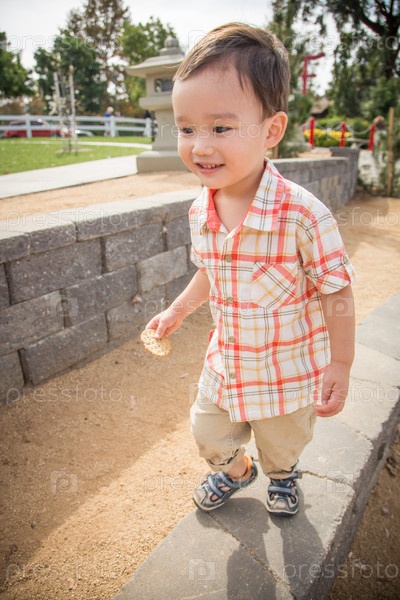 Молодой китайский и европейский мальчик, метис, развлекается в парке