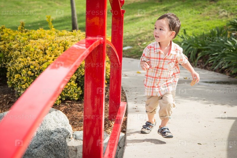 Молодой китайский и европейский мальчик, метис, развлекается в парке