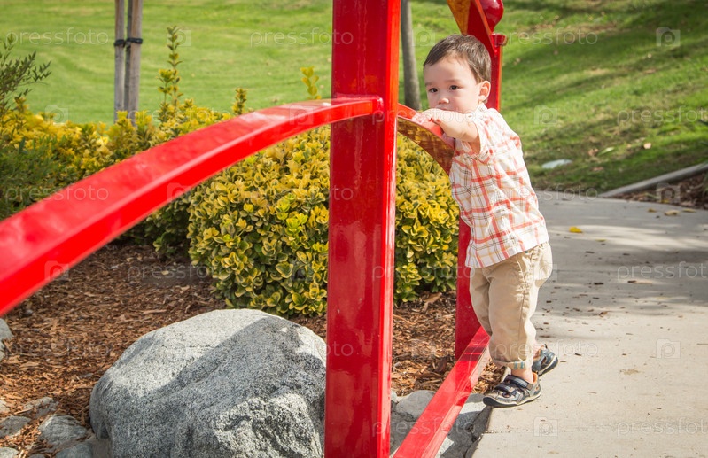 Молодой китайский и европейский мальчик, метис, развлекается в парке