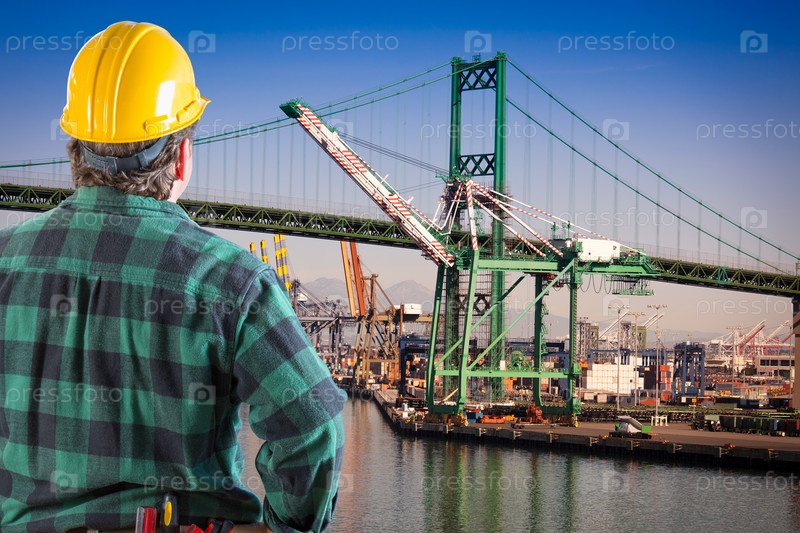 Мужчина-рабочий в желтой каске с видом на верфь и мост Сан-Педро