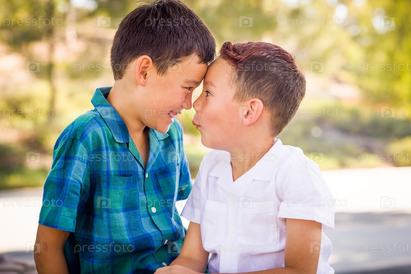 Уличный портрет двухрасовых китайских и кавказских братьев, веселящихся