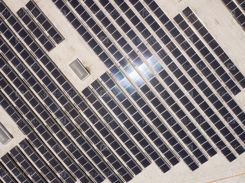 Вид с воздуха на солнечные панели, установленные на крыше большого промышленного здания или склада